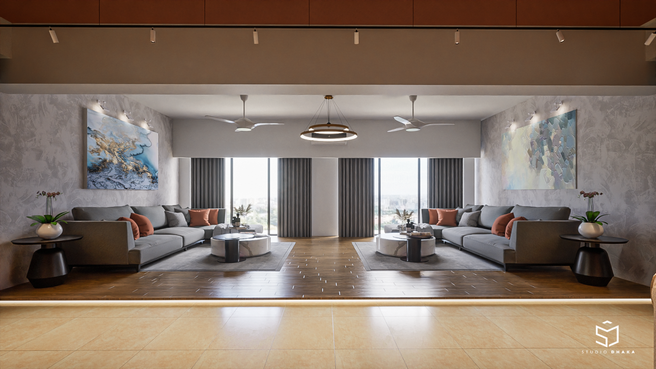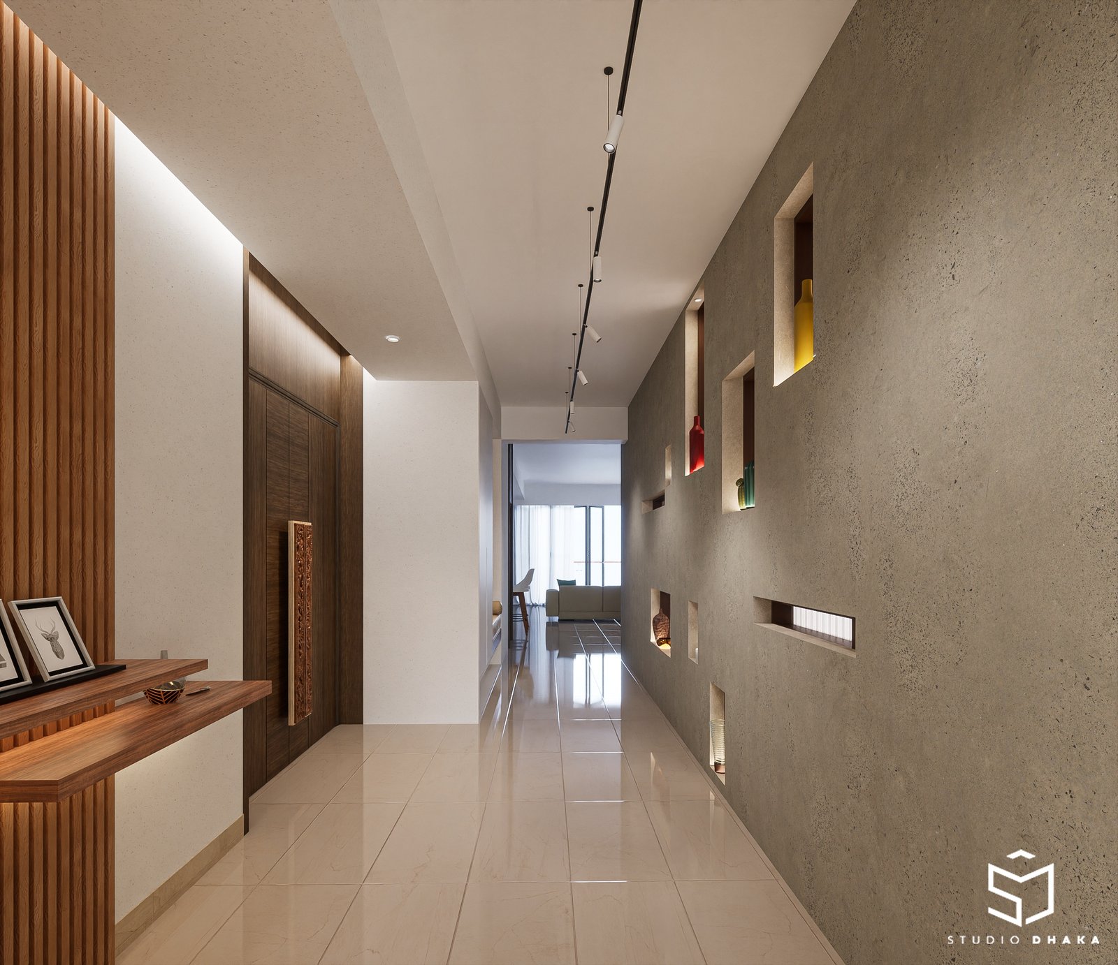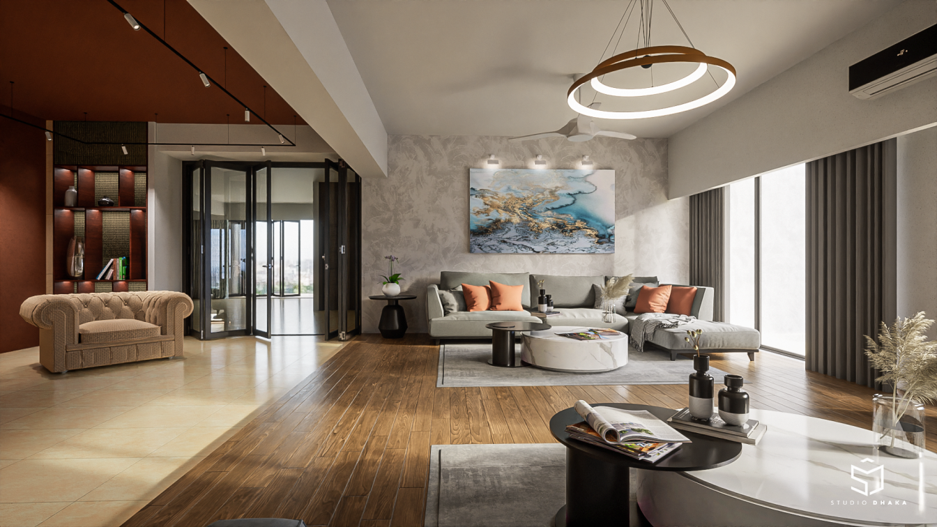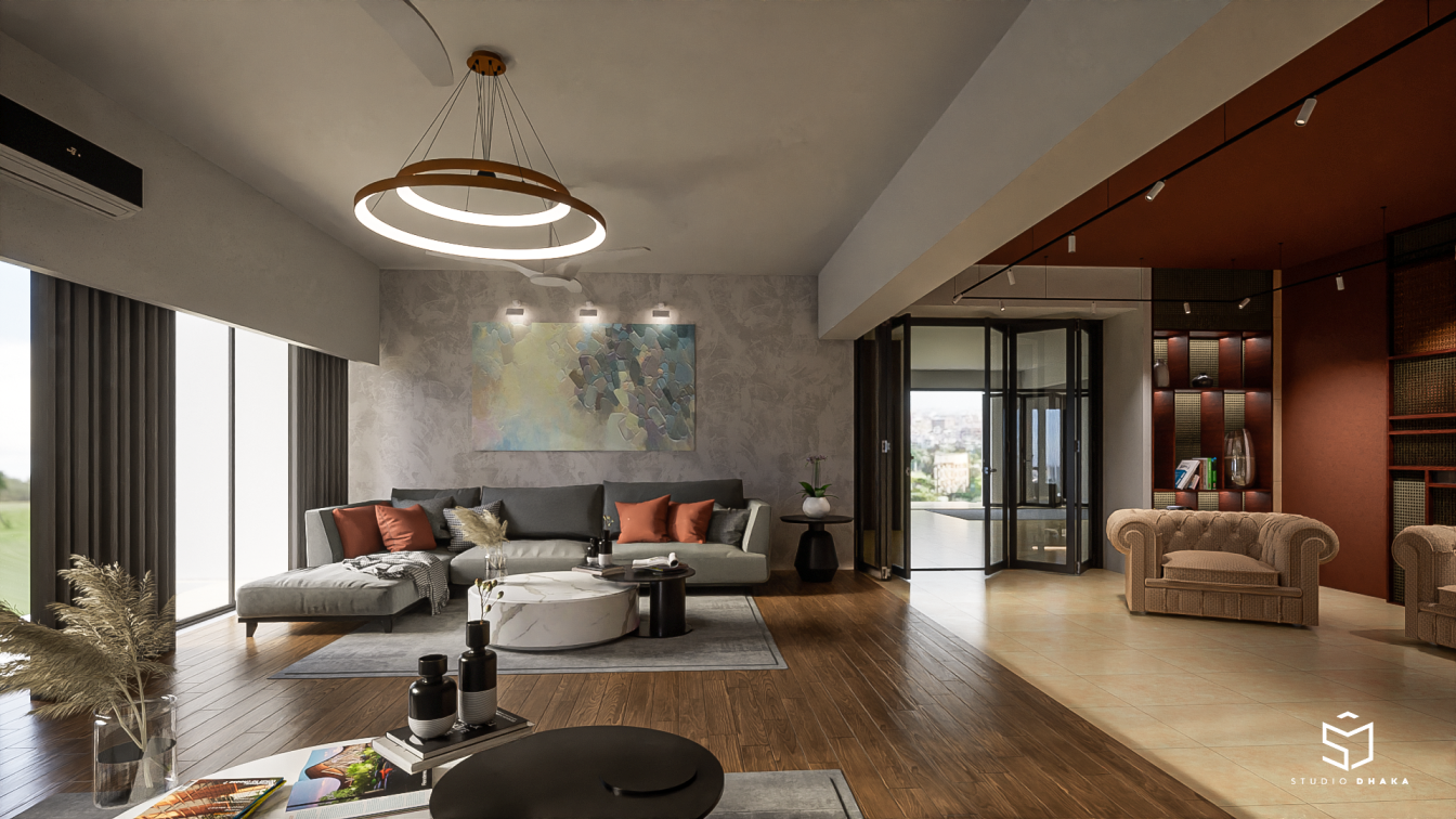 This 4000 square feet residence situated in the hilly neighborhood of Chittagong gave ample room for designing according to the client’s demands. It is a modern-styled minimalistic design with a traditional touch to it. As the client wanted a modern outlook merged with a traditional one, colors like grey, veneer wood, and Tudor oak wax have been merged with shades of traditional red seamlessly. The flow of natural light and ventilation have been given top notch priority. From multi functional furniture to customized door handles with traditional touch have been introduced in this project. Shiny floors make the space look even bigger.