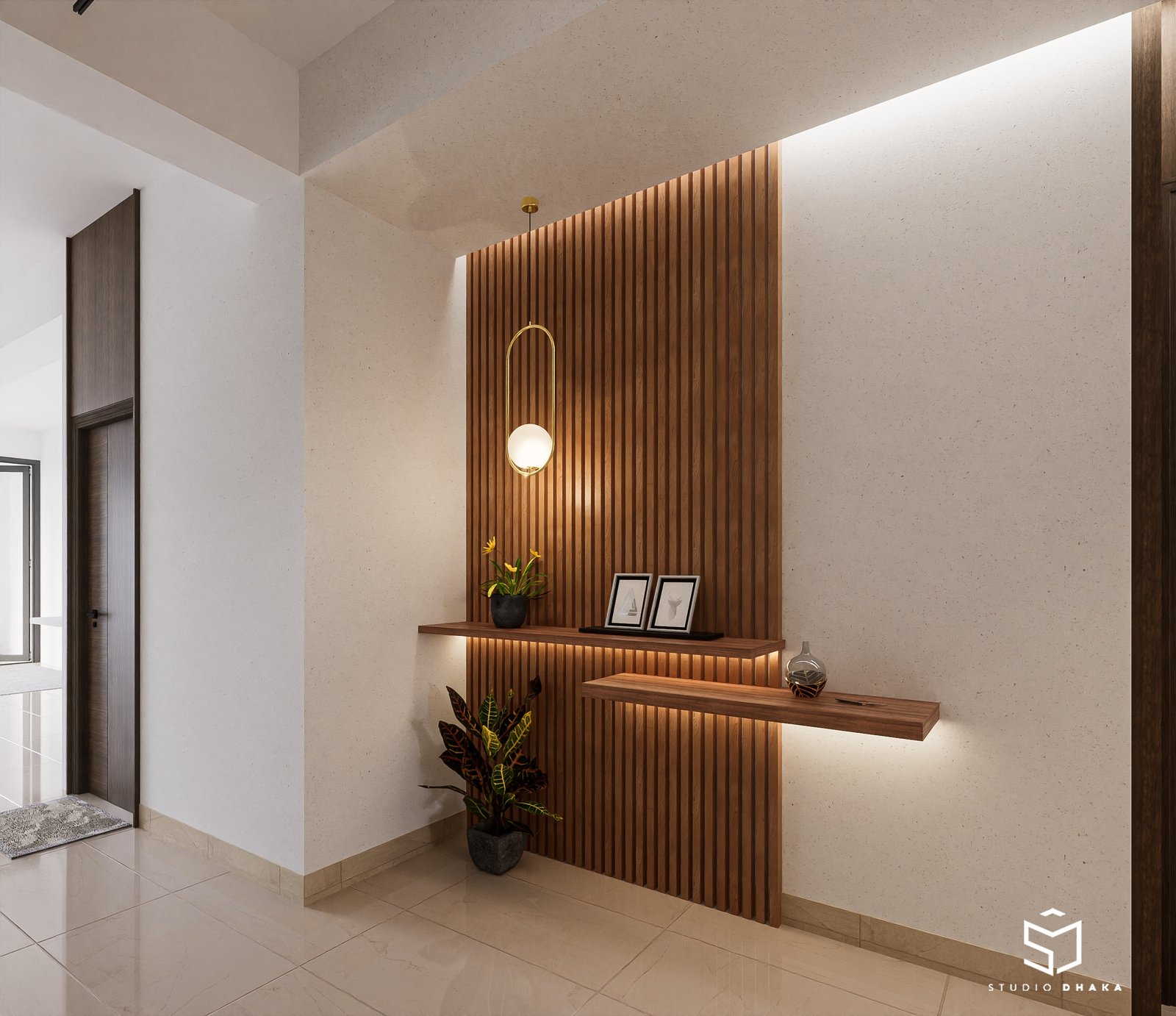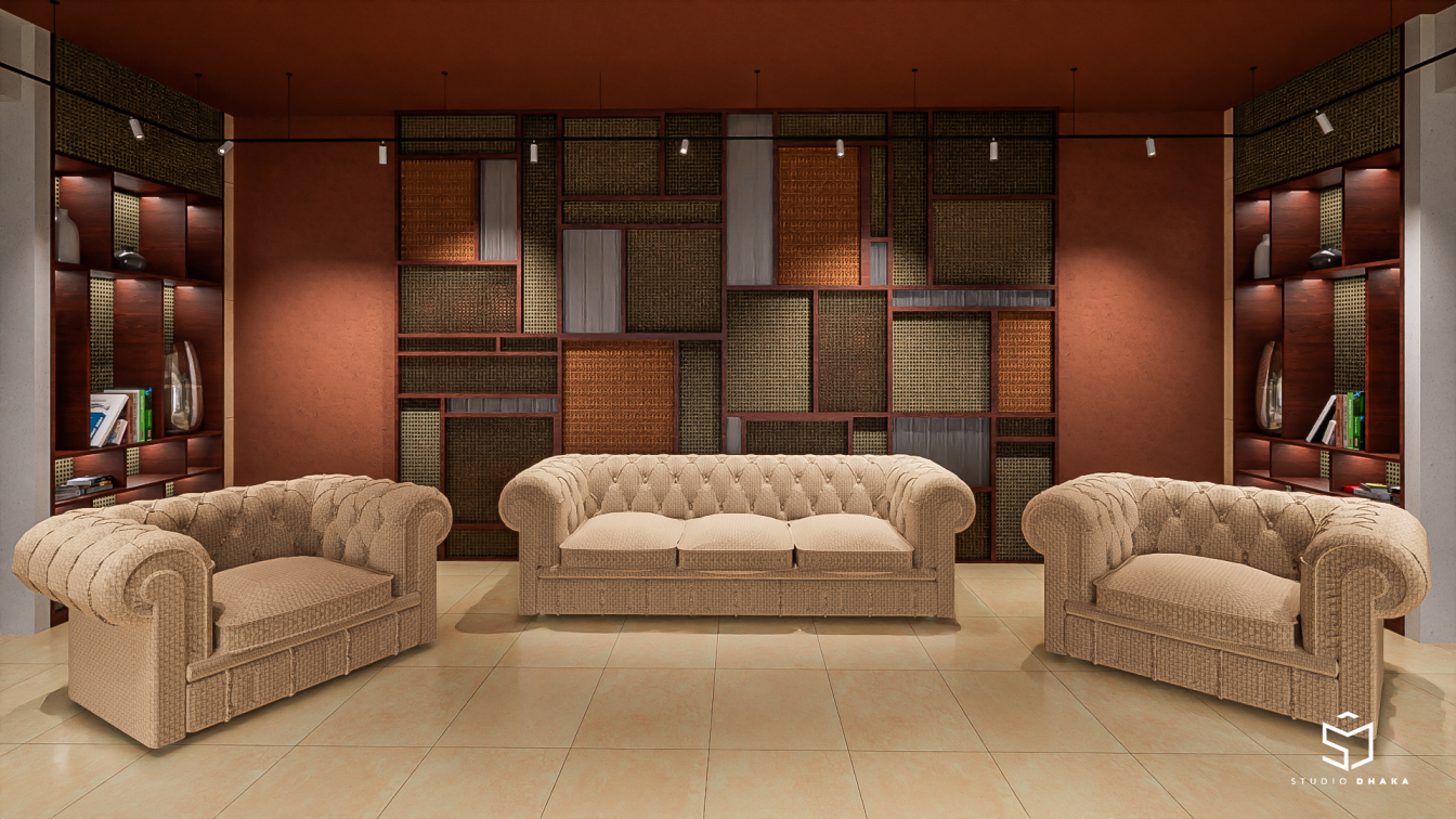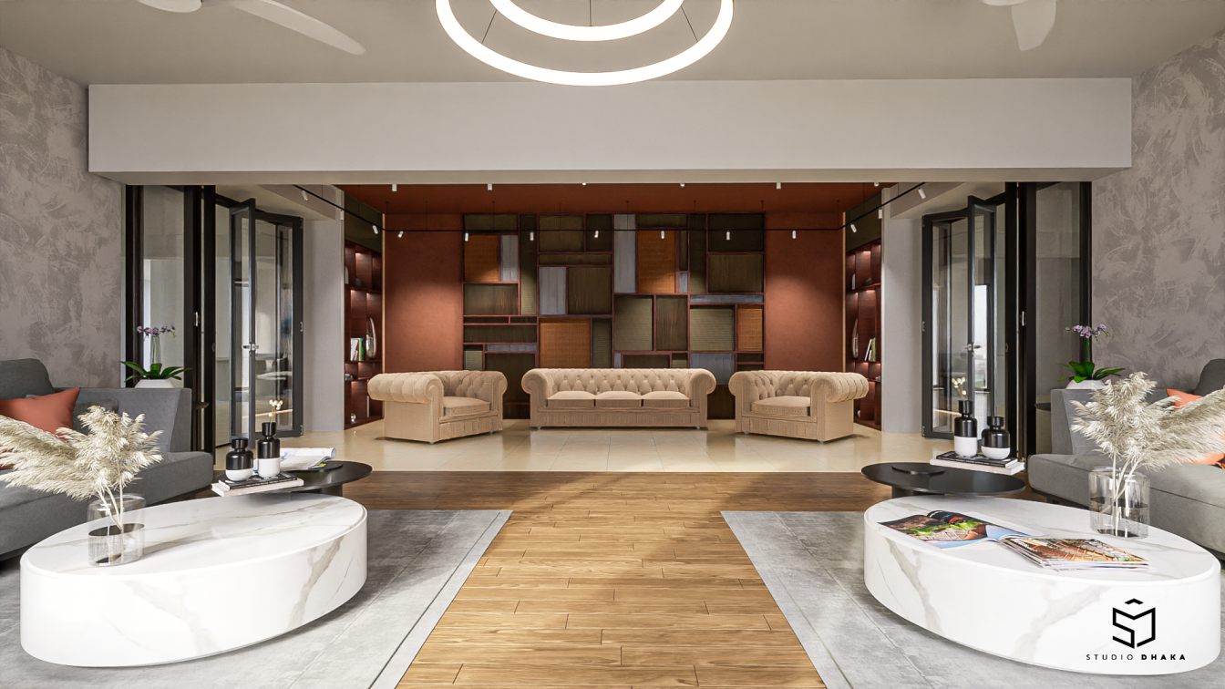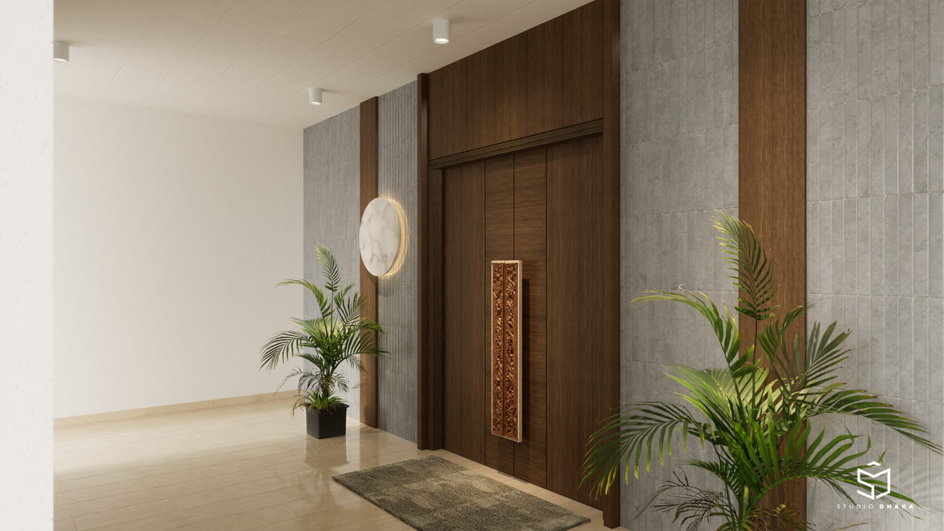 This 4000 square feet residence situated in the hilly neighborhood of Chittagong gave ample room for designing according to the client’s demands. It is a modern-styled minimalistic design with a traditional touch to it. As the client wanted a modern outlook merged with a traditional one, colors like grey, veneer wood, and Tudor oak wax have been merged with shades of traditional red seamlessly. The flow of natural light and ventilation have been given top notch priority. From multi functional furniture to customized door handles with traditional touch have been introduced in this project. Shiny floors make the space look even bigger.