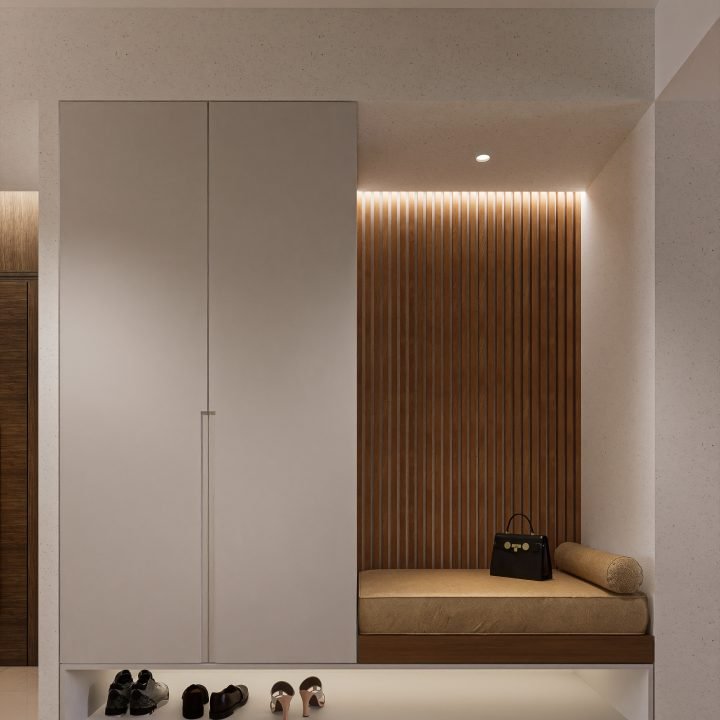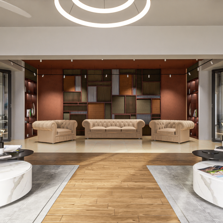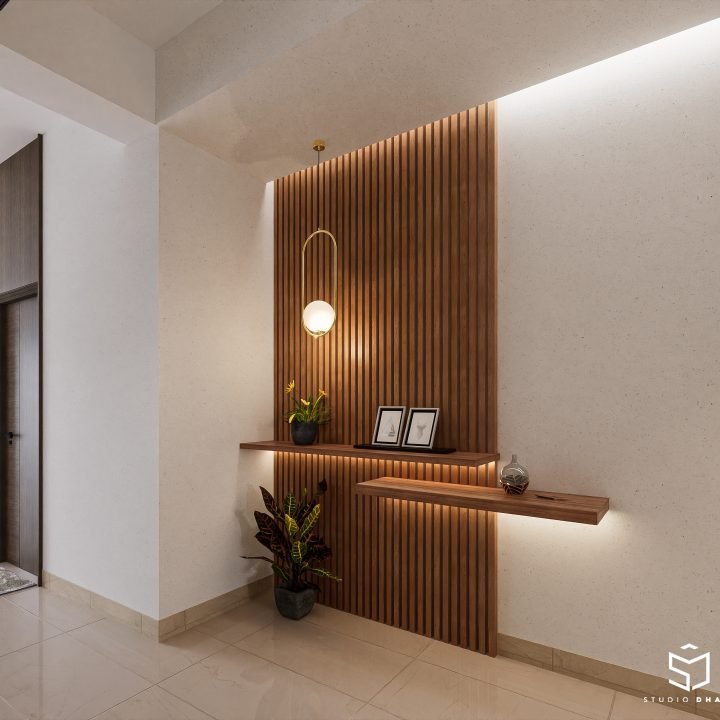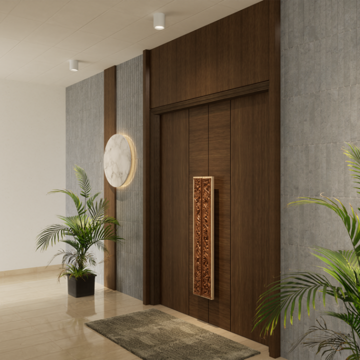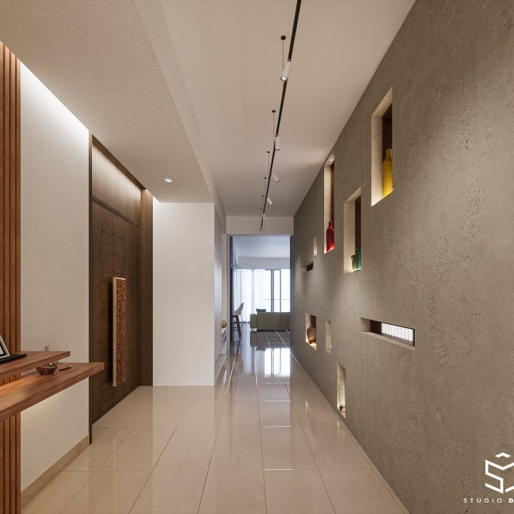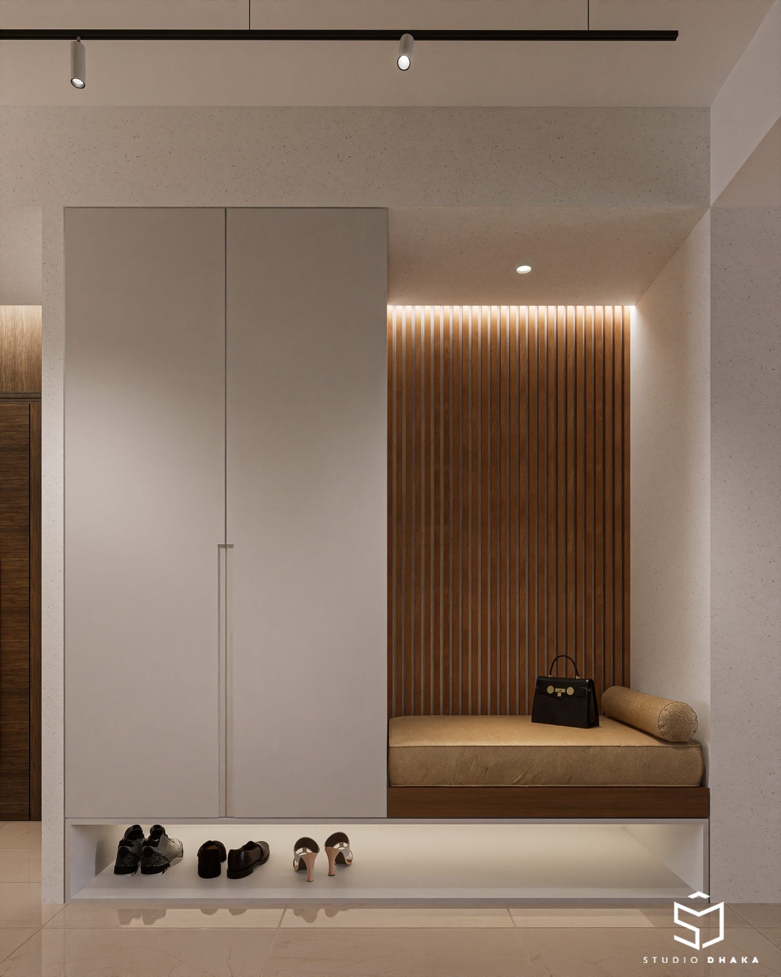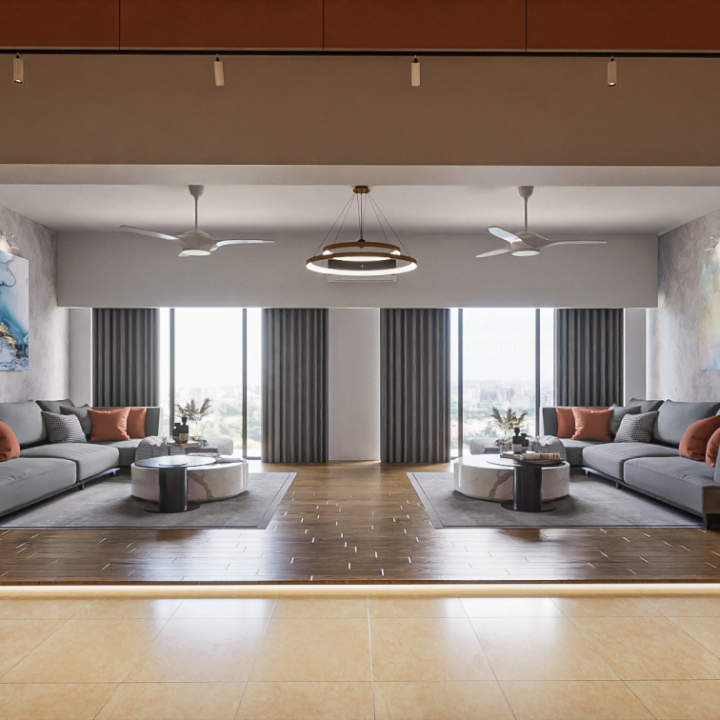 This 4000 square feet residence situated in the hilly neighborhood of Chittagong gave ample room for designing according to the client’s demands. It is a modern-styled minimalistic design with a traditional touch to it. As the client wanted a modern outlook merged with a traditional one, colors like grey, veneer wood, and Tudor oak wax have been merged with shades of traditional red seamlessly. The flow of natural light and ventilation have been given top notch priority. From multi functional furniture to customized door handles with traditional touch have been introduced in this project. Shiny floors make the space look even bigger.