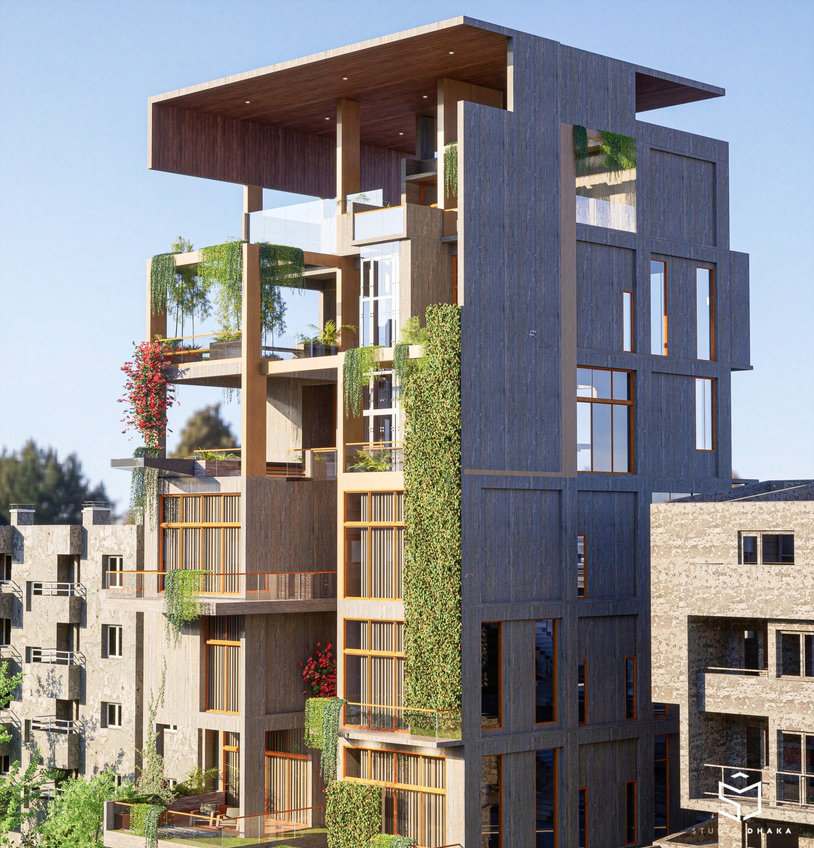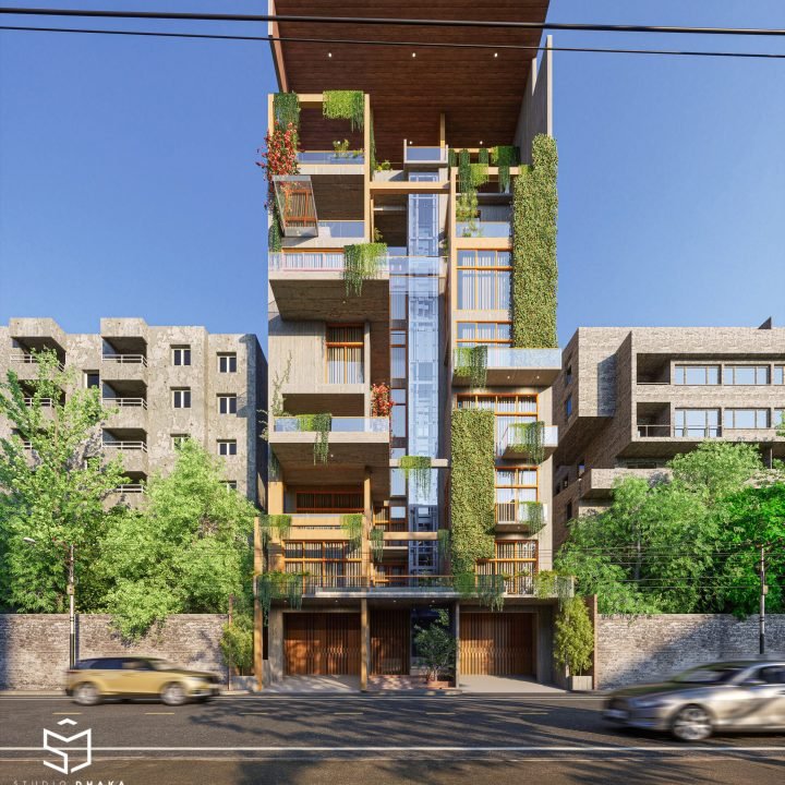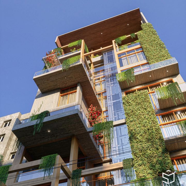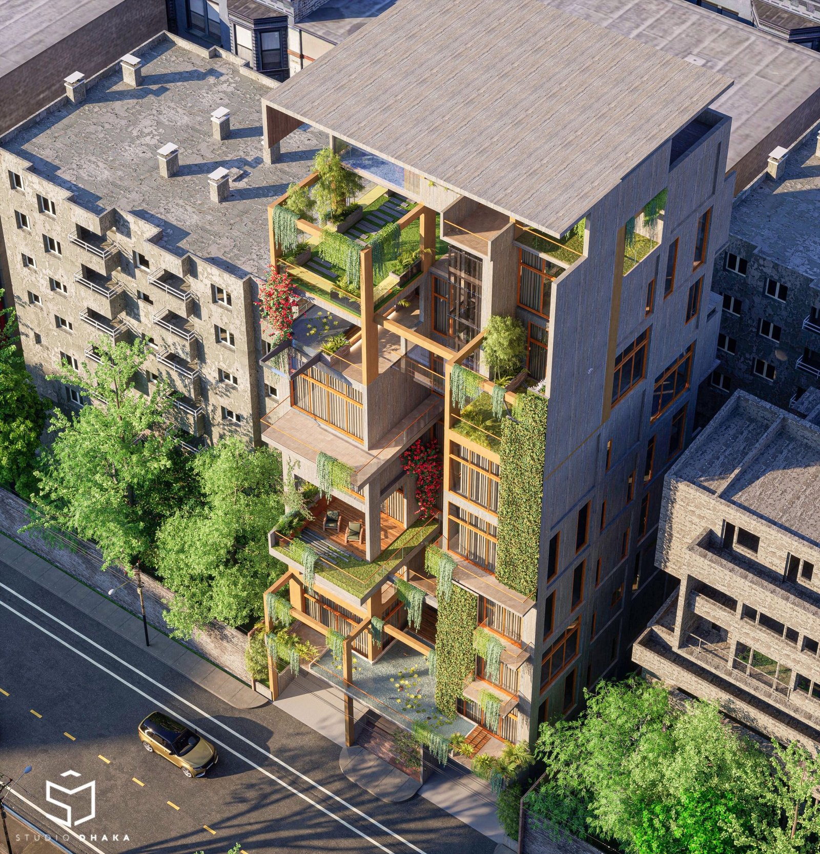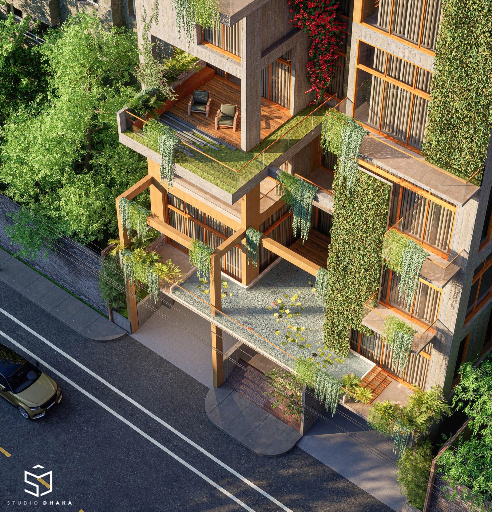 A staggering approach towards the roadside led to the development of multiple outdoor spaces and terraces. Green walls have been carefully placed keeping their maintenance in mind through such terraces. These terraces can be a source of relaxation and other individual and group activities. The central transparent glass elevator can gift users with a unique journey as one travels upward and vice versa. The roof gives a very beautiful floating effect to the whole structure.