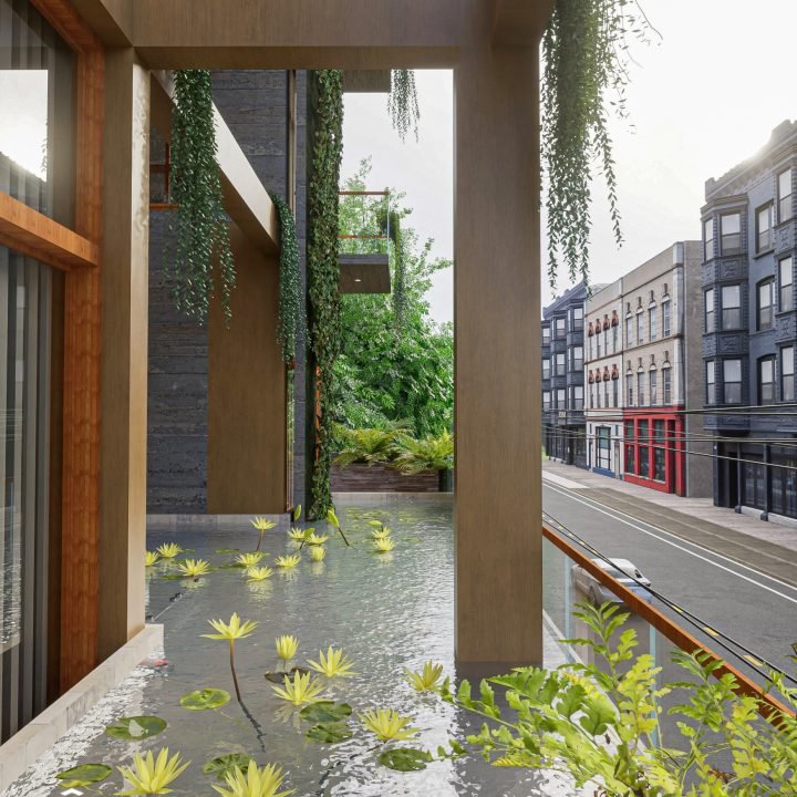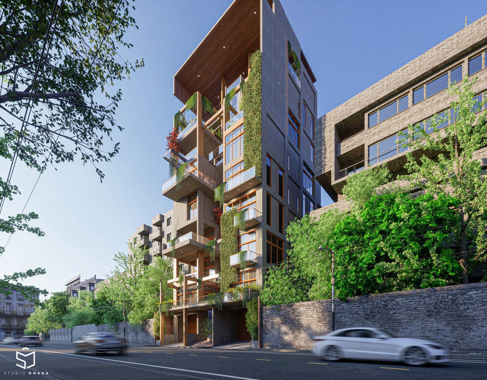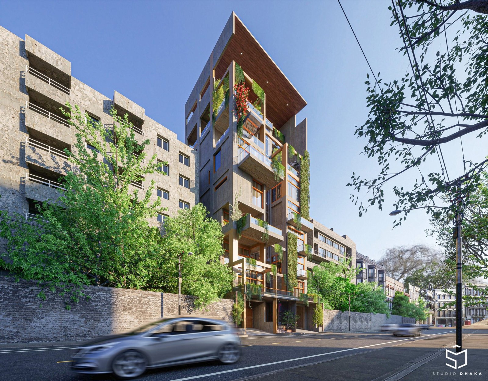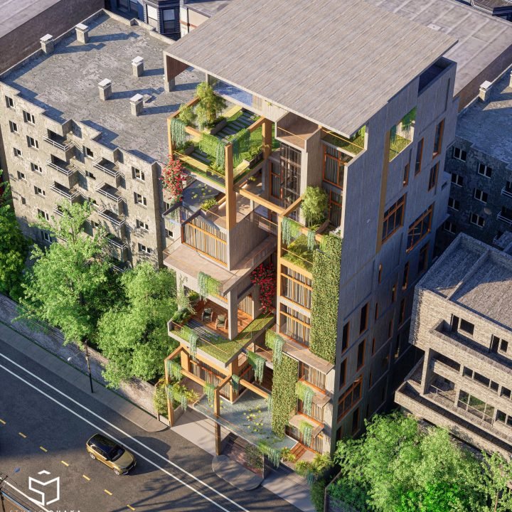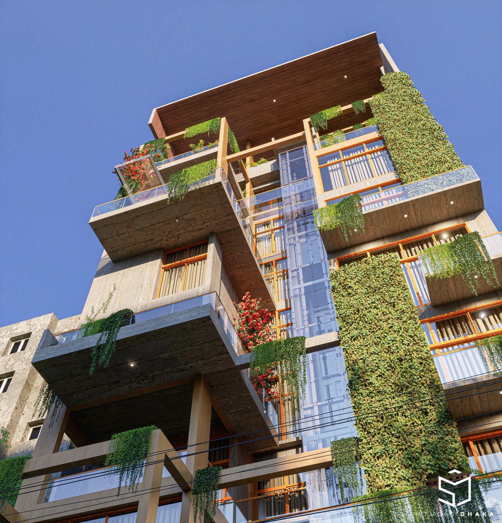 A staggering approach towards the roadside led to the development of multiple outdoor spaces and terraces. Green walls have been carefully placed keeping their maintenance in mind through such terraces. These terraces can be a source of relaxation and other individual and group activities. The central transparent glass elevator can gift users with a unique journey as one travels upward and vice versa. The roof gives a very beautiful floating effect to the whole structure.