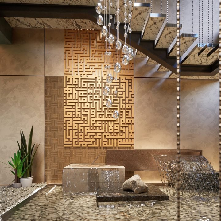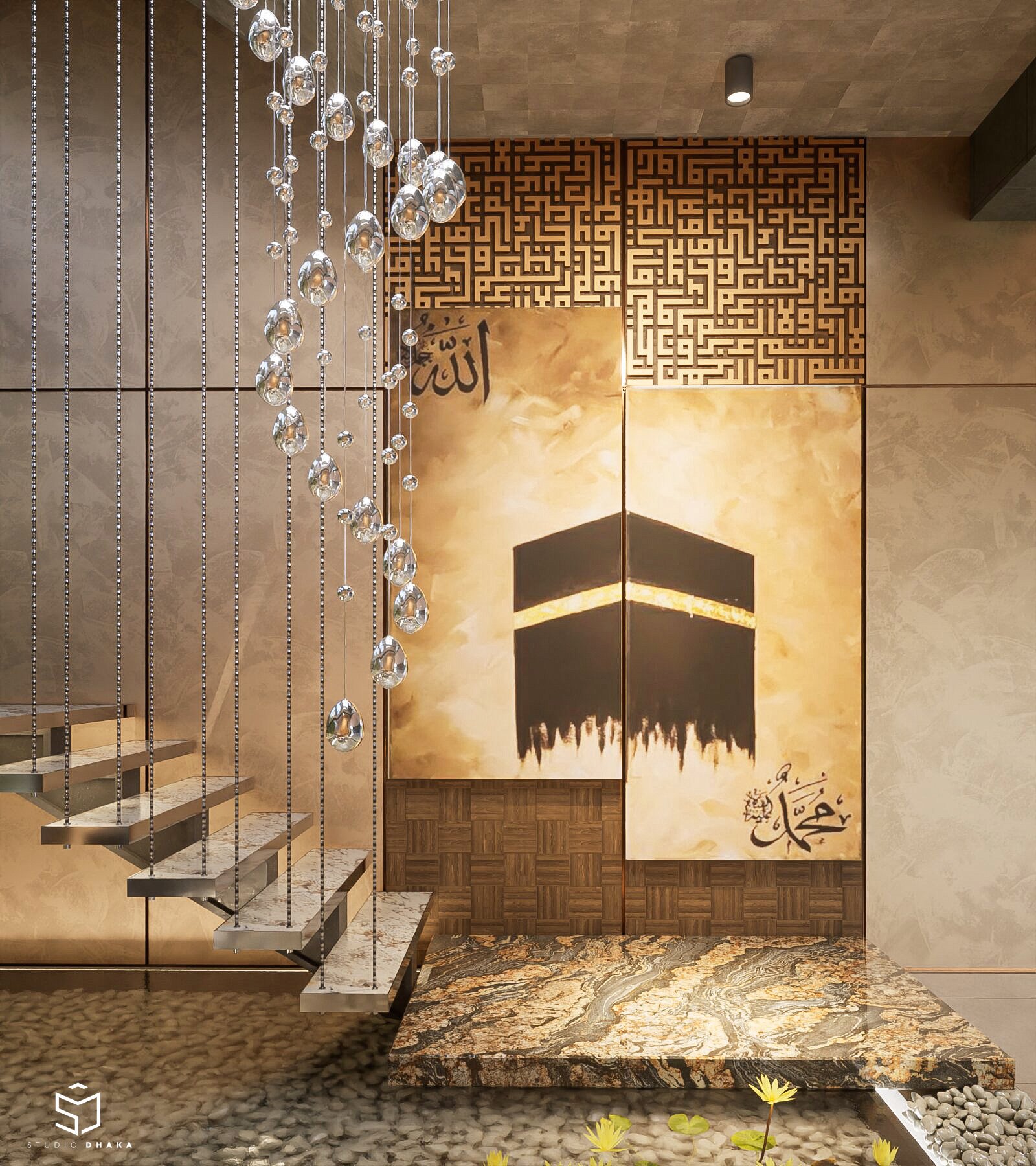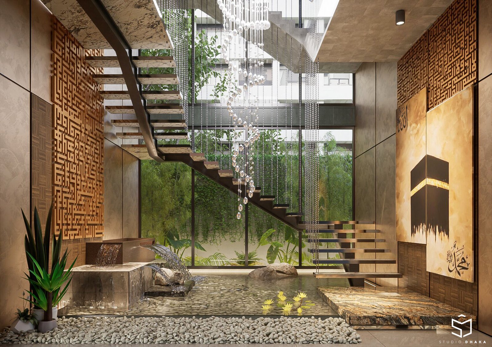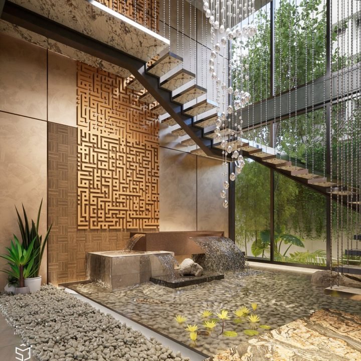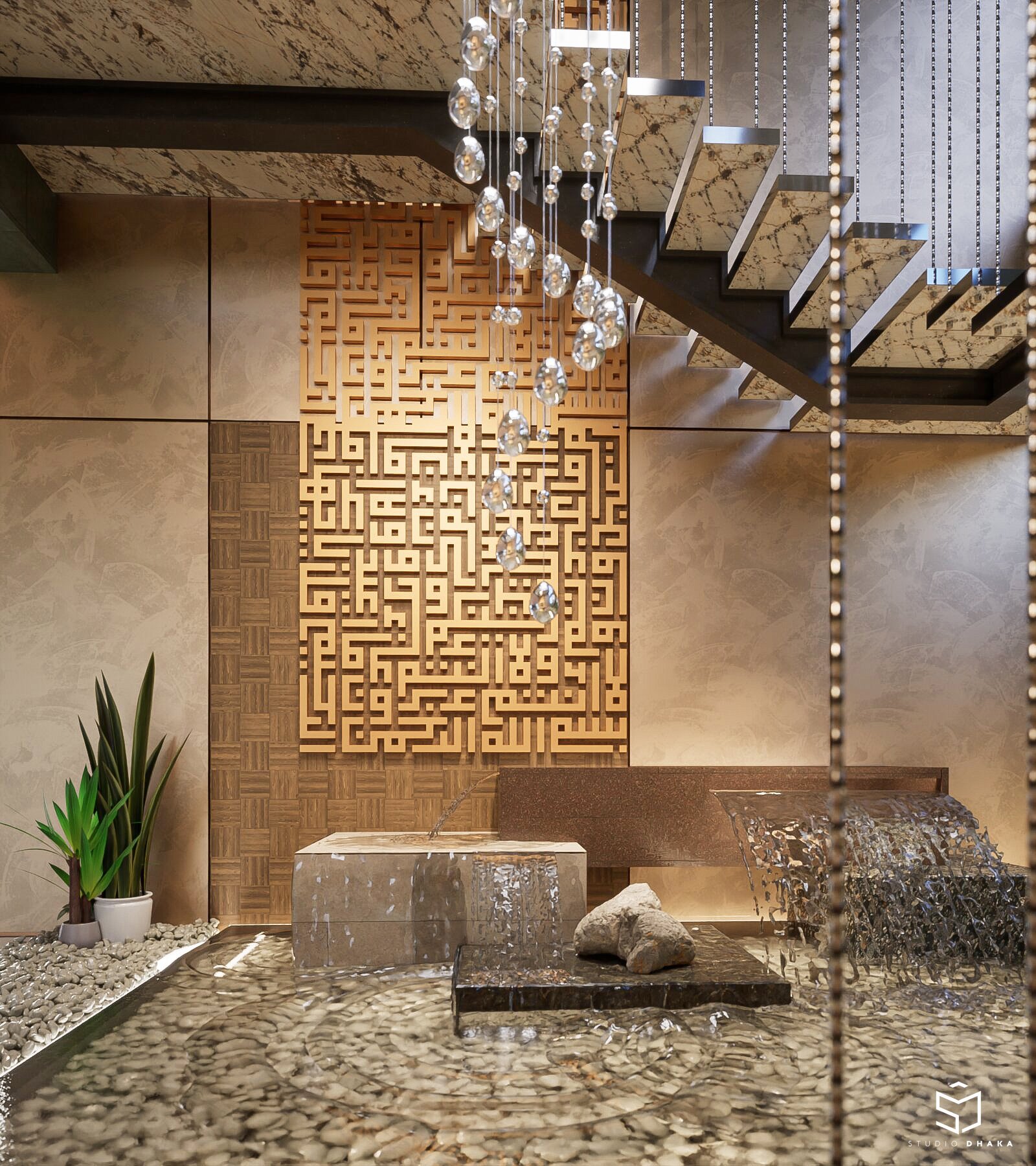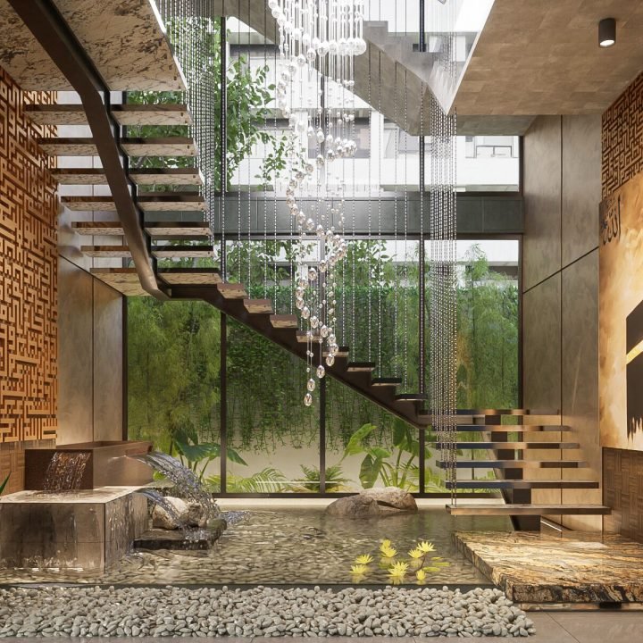 The introduction of water bodies on multiple floors is another exclusive characteristic of the project. The water body on the first floor is a long T-shaped one connecting multiple functions all at once. Accesses are given from one of the bedrooms via a balcony. Another access is from the first-floor foyer central via a glass platform. The last one is from the dining area. Accesses are carefully provided making sure one function doesn’t collide with the other.