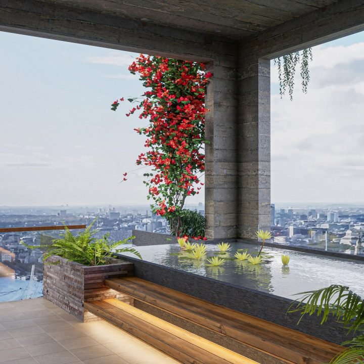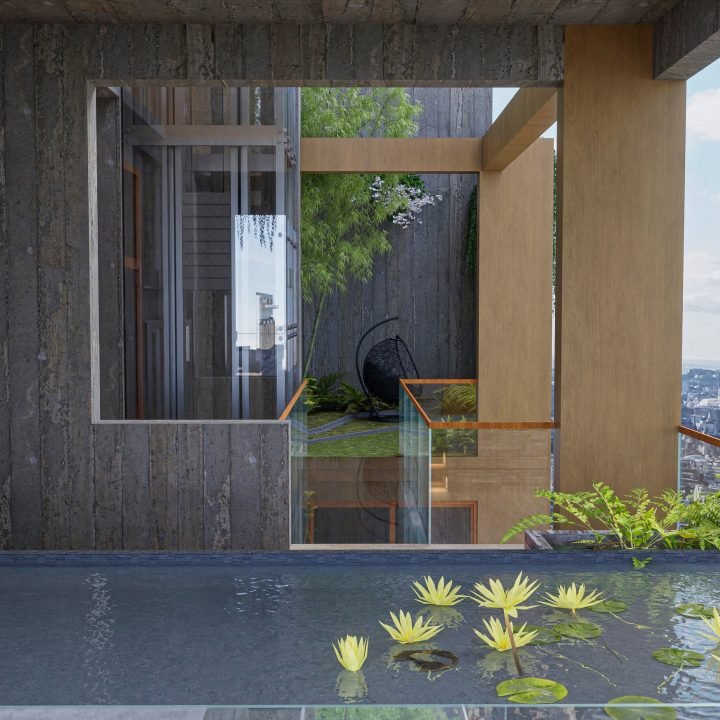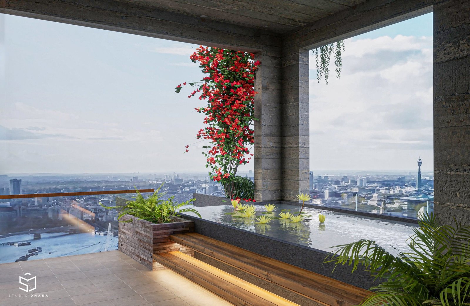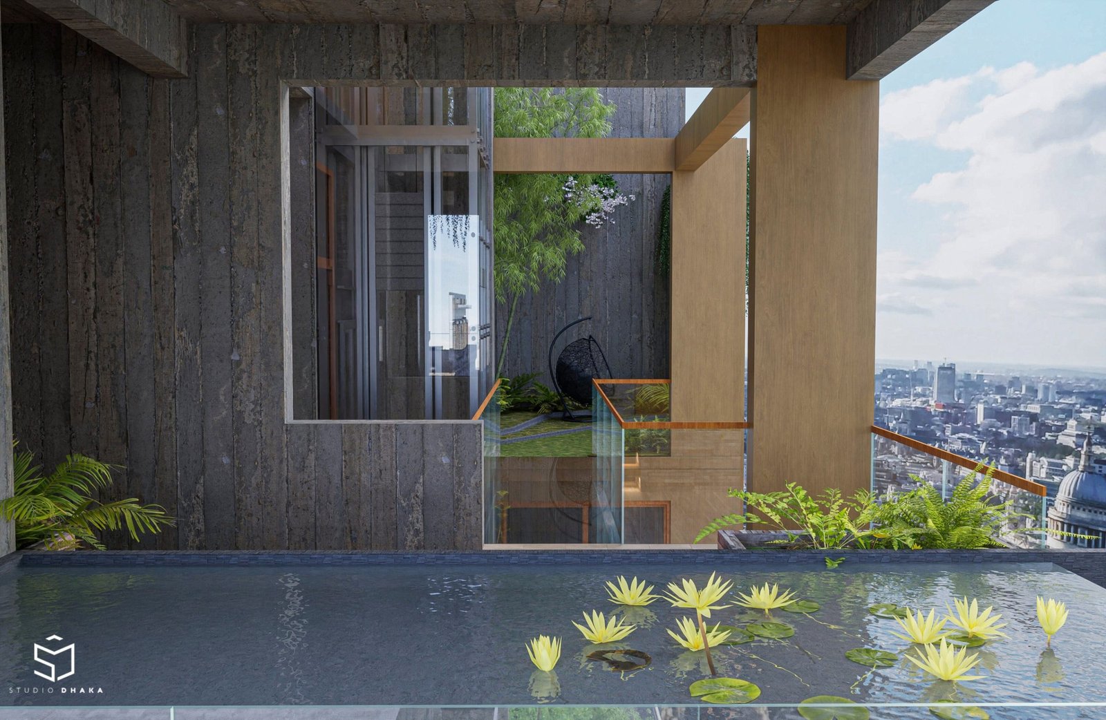 The water body placed on the sixth floor is an extended floating one. Axes are provided from two sides. A connecting glass bridge from another terrace on the left wing and a dining area on the sixth floor. Frames on both sides of the water body create a vista. The wooden steps can be used as a sitting place. Being here in close contact with the water would help elevate one’s mind. Floating waterlilies add up to the whole scenic beauty of the spot.